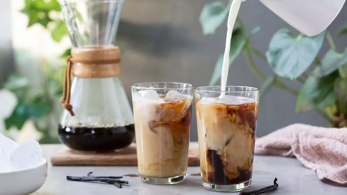 Avkjølt espresso med melk, isbiter og et hint av vaniljesirup. Dette innholdet er laget av AI Bilde: https://www.tine.no/oppskrifter/drikke/kalde-drikker/iskaffe-med-vanilje